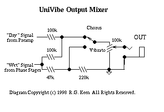 The output mixer in the Univibe is a fairly simple, but critical part of the Univibe. The buffered "dry signal" at the emitter of Q3 in the preamp section, in addition to driving the first phase shift section, also attaches to a 100K resistor in the mixer. The "wet" signal that has been through the phase shifting sections attaches to another 100K resistor, and the two 100K resistors are tied together, and that junction is connected to one terminal of the "Chorus/Vibrato" switch. The other side of the switch is attached to a resistive divider (47K/220K) which is driven only by the "wet" signal.