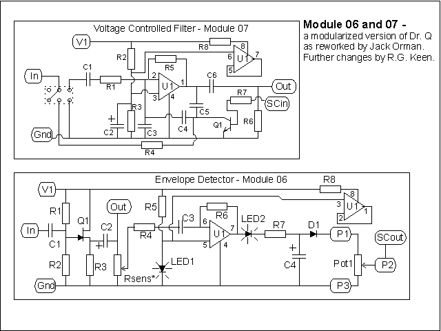 (Note: in doing this, I have borrowed from changes to the Dr. Q circuit suggested by Mark Hammer and modifications published by Jack Orman in his "Dr. Quack" project. On top of this, I've added a couple of changes of my own, as well as splitting the circuit into independent modules.)