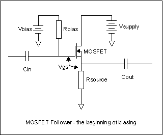 have Step 3: We need a Vbias of Vt+(Rsource*Isource) = 2.0(typically)+2.0V = 4.0V. At this point we'd calculate the biasing resistors on a real design, but I'm going to go to Step 4: We know that Vt is really going to be between 0.8V and 3.0V for the BS170 and 2N7000, so we need to check and see what the operating range really is. If Vt=3.0V really, we have generated 4.0V for Vbias and the voltage across Rsource will be the difference, or 4.0V-3.0V = 1.0V. The current through Rsource is going to be the voltage across it divided by the current through it (Ohm was right; this is really a LAW!) or 1.0V/2K = 0.5ma. The voltage across the drain resistor will be the same 0.5ma times the resistance, or (0.5ma)*(3.5K)=1.75V. The MOSFET has the rest of Vsupply across it: 9.0V-1.75V-1.0V = 6.25V. What this means is that the output voltage can't swing any higher than the 1.75V across Rdrain. We have a much smaller clean output because the Vt of the MOSFET is off at the edge of where it's supposed to be. If Vt=0.8V really, we have generated 4.0V for Vbias, and so the voltage across Rsource is really going to be Vbias (4.0v) - Vt (0.8v), or 3.2V. The current that has to flow through the resistor to get that is 3.2V/2.00K = 1.6ma. That same current will flow through Rdrain, so it will have a voltage of 3.5K*1.6ma = 5.6V across it. That means the MOSFET has only Vsupply (9v) - 5.6V - 3.2V = 0.2V across it, so the maximum negative swing the MOSFET can do is this 0.2V before it saturates. AACKKK! What happened? Only 0.2V of swing down in this case? MOSFETs have a variation in their bias voltage almost as big as JFETs, and much, much larger than bipolar transistors. Correspondingly, they are trickier to bias for large linear swings than are bipolars. MOSFETs can be biased into linear amplifiers without adjustment and tweaking, but you will either need some form of adjustment of the bias or selection of MOSFETs to get both linear (i.e. no distortion) gain and wide signal swings. So let's look at how some adjustments could be done.