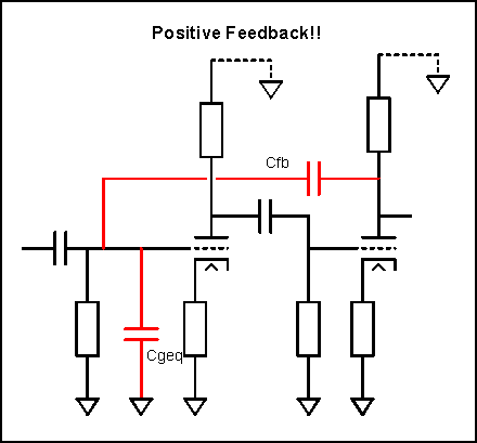 Unless we've done something special to make Cgeq smaller, it's probably on the order of 2-3pF. Let's see what Cfb makes the loop gain one, so this thing oscillates. We'd have to have a feedback loss of 900 to make this true, so the impedance of the parallel combination of Rgrid and Cgeq have to equal 1/900th of Cfb's impedance. At frequencies below F=1/(2*pi*1M*3pf) = 53kHz, the impedance is dominated by Rg, and decreases above that. Phase shift also accumulates above that, so let's take the resistance as the limiting resistance. To get oscillation, the impedance of Cfb has to be no more than 900 times Rg, so Cfb=1/(2*pi*900M*10kHz) = 0.018pF. ACK!! 18 FEMTO-FARADS???? HOW DOES THIS THING EVER WORK AT ALL??