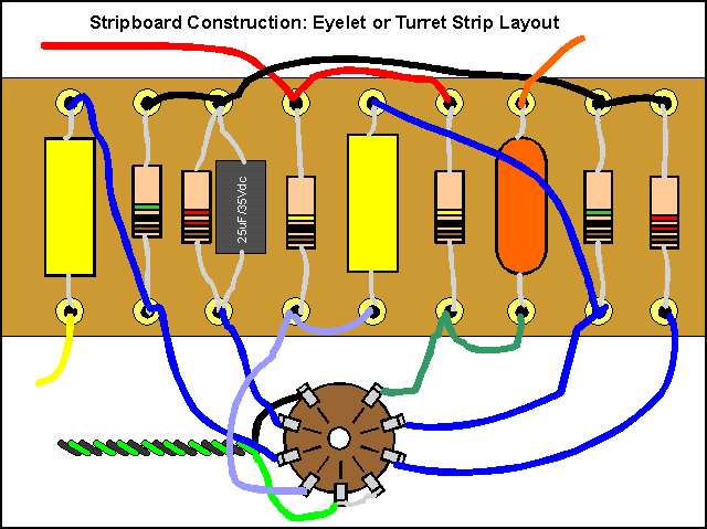All the connections to tube sockets are made with wires from the stripboard to the tube sockets and controls. Note that unlike true PTP, the wiring lengths from the components to the tube sockets are no longer as short as they were. Also, the wires are often stranded wire, and free to move around, where the component leads in PTP were solid, and pretty much held in place by being short and stiff. To get easier wiring, we have sacrificed the very short interconnections that are a characteristic of good PTP wiring.