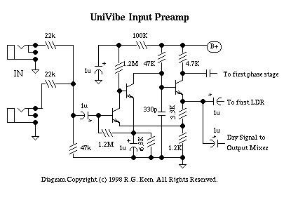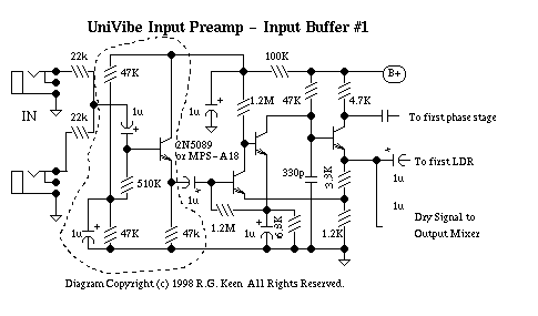 Most 'vibe afficianados don't think of it this way, but the stock 'vibe suffers from some of the same problems that the unmodified crybaby does. The input resistance to either input is only 69K (22K plus 47K). This is low enough to significantly load the output of a guitar and dull the sound. In the stock vibe, you pay this price to a degree even when "bypassed", as the "cancel" switch is not a bypass, it merely turns off the lamp, and the signal still goes through the phase stages with the LDR's at very high resistance.