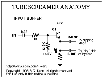 This input stage is always connected to the input signal, not switched at all. Since complaints of "tone sucking" do not follow the TS9 and 808 around, apparently this is a high enough impedance to avoid loading guitar pickups too much like the common wah pedals do. Parenthetically, it's possible to avoid the "tone sucking" of the wah pedals by copying the TS series input buffer in front of them. Some people have expressed interest in converting the TS to a true bypass switching arrangement; I'll explain how to do that later.