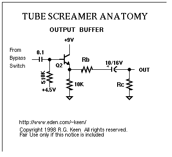 However, the 10K shunt resistor load on the TS808 output does have an effect on the follower's operation. An emitter follower with a resistor load is often assumed to have a very low output impedance, which is true, as long as the signal is going up. However, when the signal is going down, the transistor can only turn off, and the signal is pulled down by the net loading, DC and AC on the emitter. The 10K shunt resistor effectively halves the emitter loading on the output buffer. This does two things; trivially, it reduces the input impedance of the emitter follower; more importantly it reduces the negative going output impedance of the stage by half to about 5K. This means that the output stage can drive the following stage off about twice as hard.