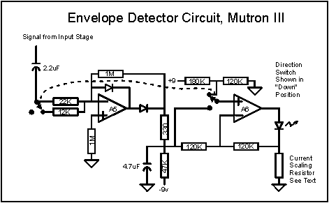 The inverter circuit A6 determines whether the detected envelope causes the filter to sweep higher in frequency on louder notes or lower with louder notes - the difference between a "wah" and an "ow" sound.