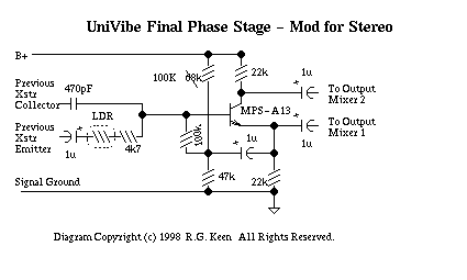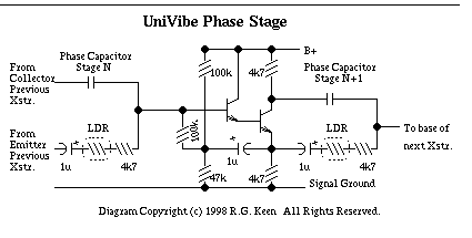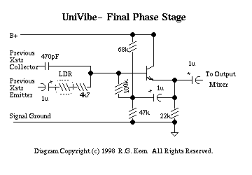 Although it is clear how the phase shift stages work, it is not at all lear why the phase capacitor values that exist in the univibe were chosen. The correct values are 0.015uF, 0.22uF, 470pF, and 0.0047uF. These values are NOT any progression of values that I can come up with that would be meaningful in an acoustic sense. I'm fairly sure that they were not chosen randomly, but I can't figure out why they are what they are. I've corresponded with a number of people with ideas about why they think the cap values are what they are, but haven't yet found an explanation that satisfies me.