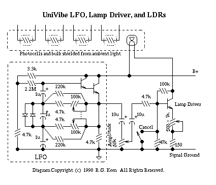 The lamp driver does three functions: (1) it sets the static level of current to the lamp; that is, the current which the bulb sits at when the amplitude is turned to zero; (2) it buffers and drives the LFO waveform into the bulb so the brightness varies; and (3) it provides a Cancel function, which is used in lieu of any bypass. The Univibe is another of those pedals that has no bypass at all - the Cancel turns off the light to all the LDR's, which means that the signal goes almost entirely through the phasing capacitors and no phasing is audible. The original box would be much better off with a real bypass. This will cause problems with the static level; we'll talk about that later.