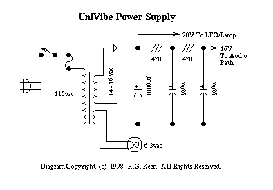 The single diode feeds a first capacitor of 1000uF, to make about 22VDC which goes to supply the LFO section and the incandescent lamp. The LFO and lamp do not carry any signal, so any ripple in their supply is not a sound quality issue. After the first filter, there are two RC filters, with 100 ohm resistors feeding another 1000uF and finally a 100uF capacitor. This setup produces a well filtered supply of about 16VDC to the signal path. The actual voltage varies a bit, depending on the transformer, lamp brightness, and component tolerances.