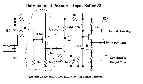 Most 'vibe afficianados don't think of it this way, but the stock 'vibe suffers from some of the same problems that the unmodified crybaby does. The input resistance to either input is only 69K (22K plus 47K). This is low enough to significantly load the output of a guitar and dull the sound. In the stock vibe, you pay this price to a degree even when "bypassed", as the "cancel" switch is not a bypass, it merely turns off the lamp, and the signal still goes through the phase stages with the LDR's at very high resistance.