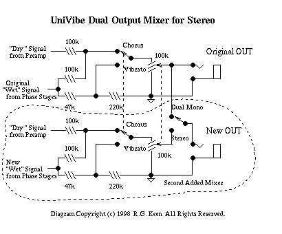 The output mixer in the Univibe is a fairly simple, but critical part of the Univibe. The buffered "dry signal" at the emitter of Q3 in the preamp section, in addition to driving the first phase shift section, also attaches to a 100K resistor in the mixer. The "wet" signal that has been through the phase shifting sections attaches to another 100K resistor, and the two 100K resistors are tied together, and that junction is connected to one terminal of the "Chorus/Vibrato" switch. The other side of the switch is attached to a resistive divider (47K/220K) which is driven only by the "wet" signal.